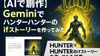 AI入門・Gemini入門 【AIで創作】Gemini『Storybook』でハンターハンターのifストーリーを作ってみた結果… もしも、ハンターハンターの"あの展開"が違ったら…?漫画好きなら誰もが一度は考えたことがあるはずです。「もし、あの場面の展開が違っていたら──?」私もその一人で、特に『HUNTER×HUNTER』は年... 2025.10.03 AI入門・Gemini入門Gemini活用事例使い方・チュートリアル